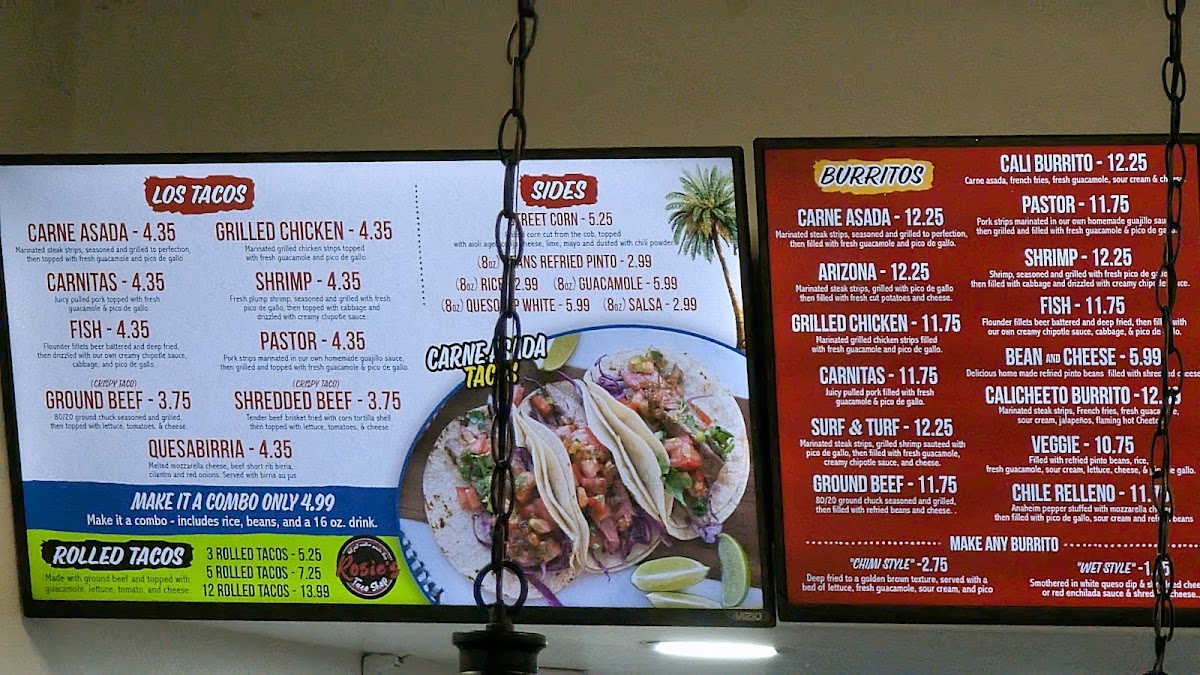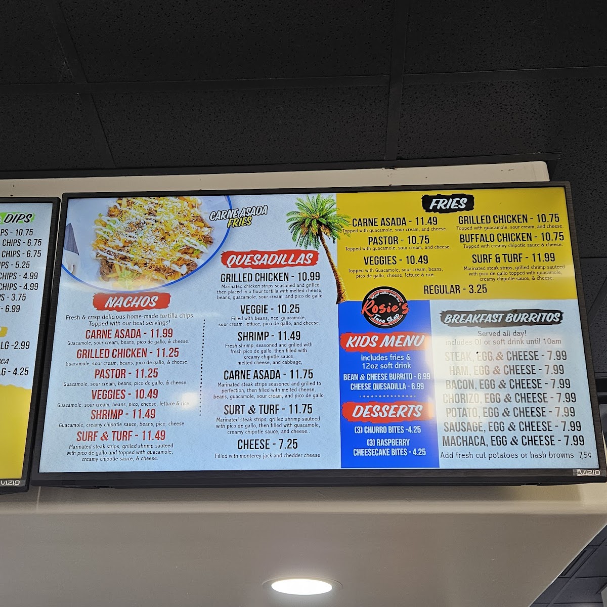 Rosie’s Taco Shop offers a straightforward and approachable menu centered around classic, satisfying tacos and burritos. The selection features familiar favorites like chicken quesadillas, crispy beef tacos, and hearty breakfast burritos, alongside flavorful regional specialties such as the Arizona Burrito and fresh fish tacos. Complementary sides like esquites and house-made salsa provide simple yet authentic additions that enhance the meal.